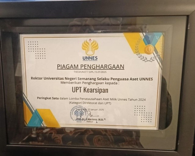 UPT Kearsipan UNNES memperoleh piagam penghargaan peringkat satu dalam lomba penatausahaan aset milik UNNES tahun 2024 kategori Direktorat dan UPT yang diselenggarakan oleh BMN dan disampaikan oleh Direktur Umum dan Sumber Daya Manusia pada hari Kamis, 27 November 2025 di Wujil Resort & Convention.