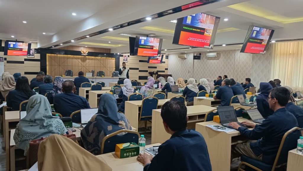 Suasana pelatihan berlangsung interaktif. Peserta aktif berdiskusi terkait identifikasi risiko, serta mempelajari cara pemetaan risiko melalui risk mapping dan key risk indicators. Pada sesi akhir, peserta melakukan simulasi penyusunan peta risiko untuk meningkatkan pemahaman praktik lapangan.