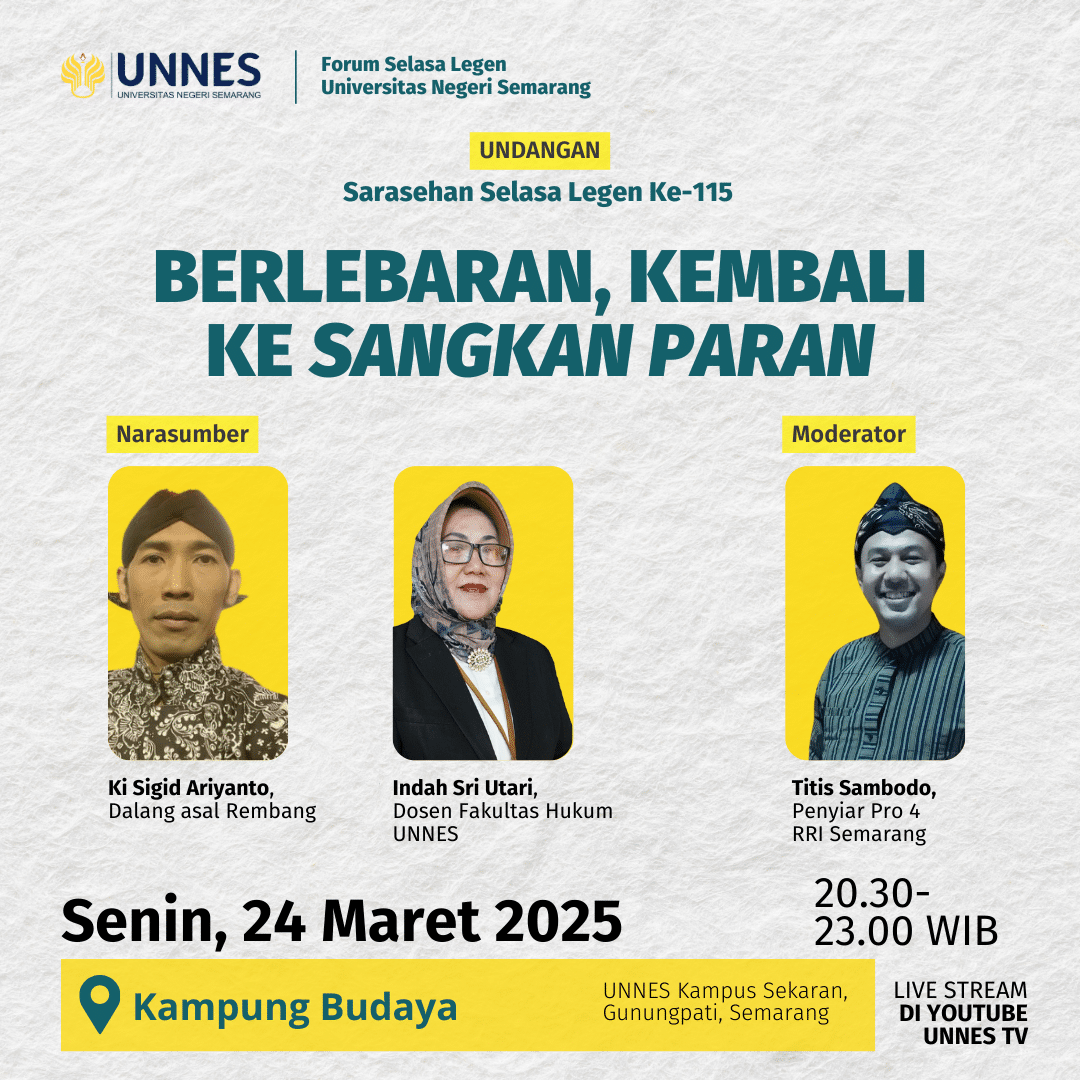 Two speakers will be present to explore the philosophical and cultural aspects of Eid al-Fitr: Ki Sigid Ariyanto, S.Sn., a puppeteer (dalang) from Rembang, and Dr. Indah Sri Utari, a lecturer at the Faculty of Law, UNNES. The event will be moderated by Titis Sambodo, S.Pd., a Radio Republik Indonesia (RRI) Semarang announcer.