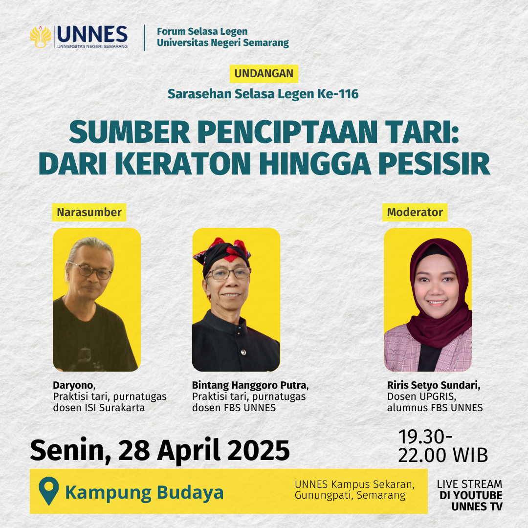The Selasa Legen Discussion Forum at Universitas Negeri Semarang (UNNES) will present the theme “Sources of Dance Creation: From Keraton to Coast” at its 116th session on Monday (April 28, 2025) at the Kampung Budaya Fakultas Bahasa dan Seni, from 7:30 PM to 10:00 PM WIB.