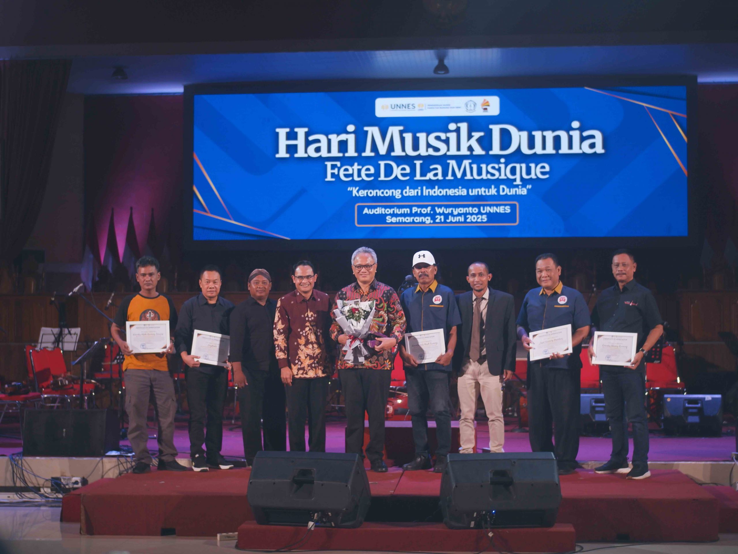 Program Studi Pendidikan Seni Musik Fakultas Bahasa dan Seni Universitas Negeri Semarang (UNNES) menyelenggarakan perayaan Hari Musik Dunia Fête de la Musique pada Sabtu, 21 Juni 2025, di Auditorium Prof. Wuryanto. Tahun ini, perayaan mengusung tema “Keroncong dari Indonesia untuk Dunia” sebagai bentuk dukungan terhadap pengajuan musik keroncong sebagai warisan budaya takbenda UNESCO.