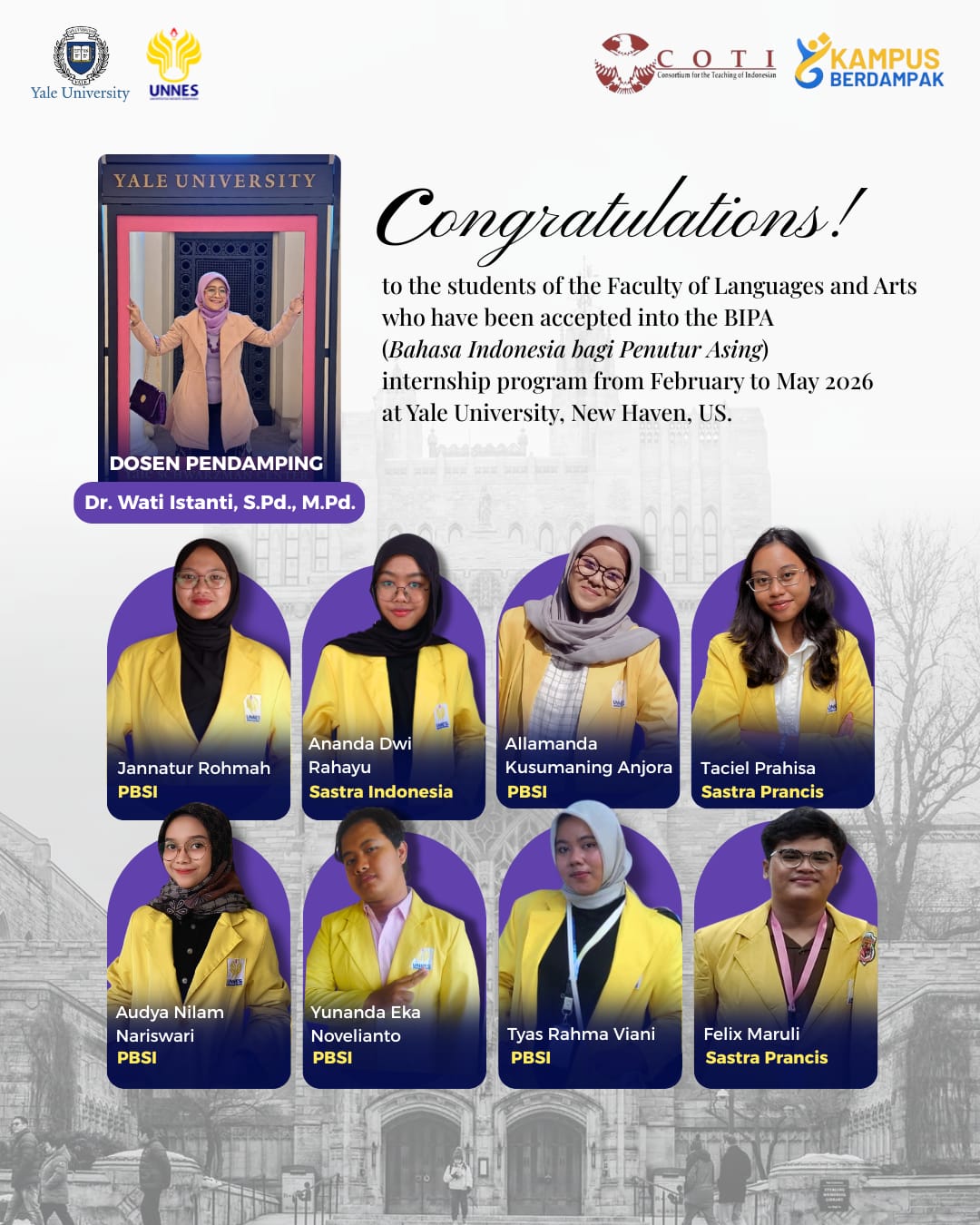 Sebanyak delapan mahasiswa Fakultas Bahasa dan Seni (FBS) Universitas Negeri Semarang (UNNES) terpilih mengikuti Program Magang BIPA (Bahasa Indonesia bagi Penutur Asing) yang diselenggarakan oleh Asosiasi Dosen Bahasa dan Sastra Indonesia (ADOBSI) bekerja sama dengan Yale University, Amerika Serikat.
