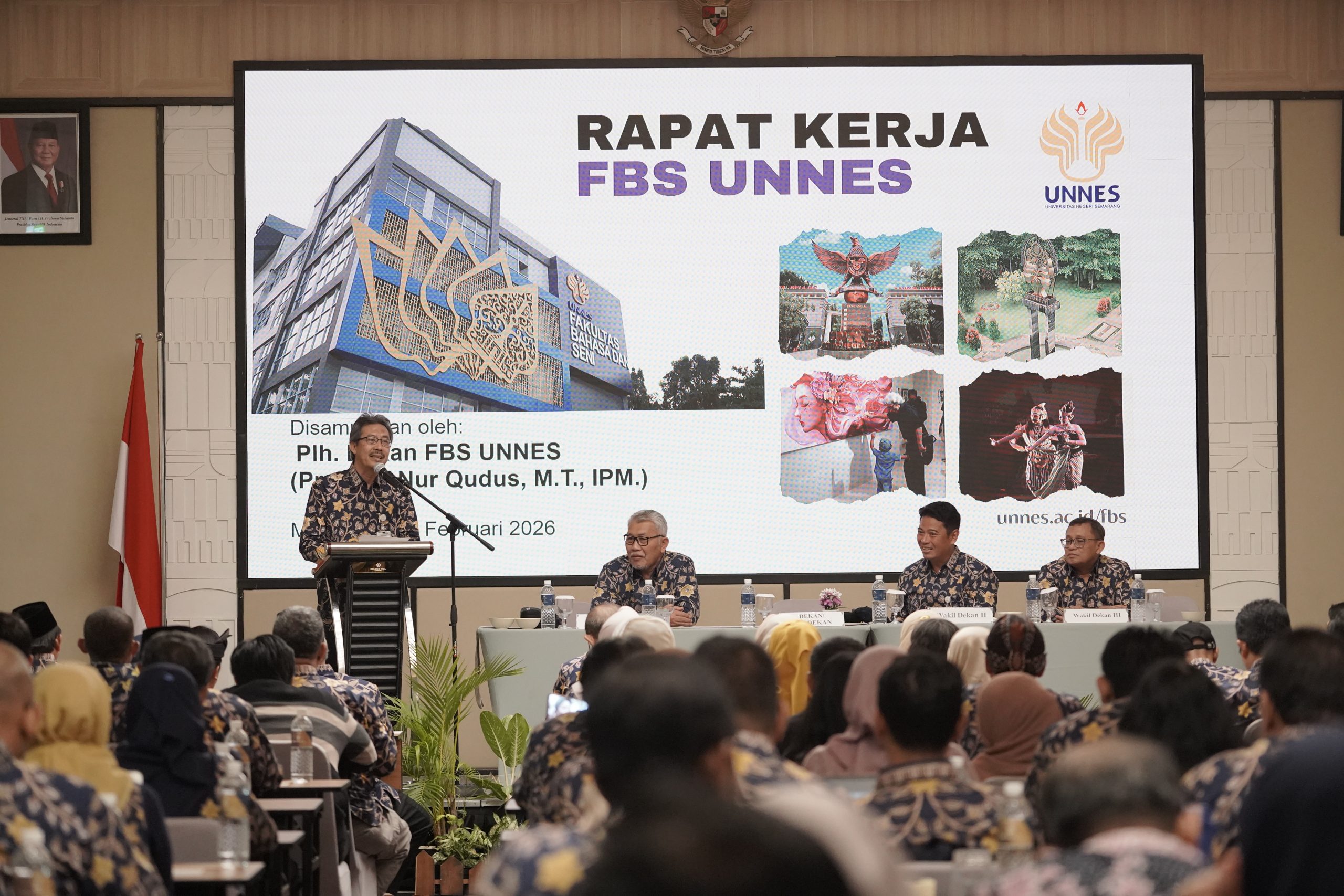 Pelaksana Harian (Plh) Dekan Fakultas Bahasa dan Seni (FBS) Universitas Negeri Semarang (UNNES), Prof. Dr. Nur Qudus, M.T., IPM., memberikan arahan strategis kepada seluruh pimpinan program studi dan unit kerja dalam Rapat Kerja FBS UNNES yang digelar di Hotel Golden Hill, Malang, Selasa (4/2/2026). Arahan tersebut difokuskan pada upaya peningkatan kinerja program studi dan sumber daya manusia (SDM) guna mencapai target kinerja FBS pada tahun 2026.