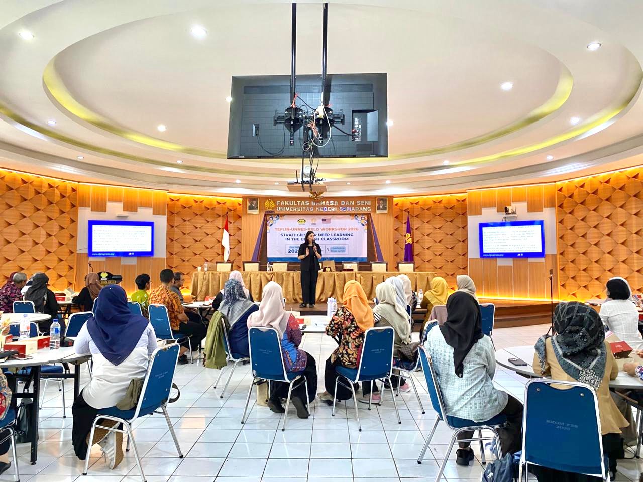 Dalam rangka meningkatkan kualitas pembelajaran Bahasa Inggris di Indonesia, TEFLIN Central Java Chapter bersama Program Studi Pendidikan Bahasa Inggris S1 dan S2 Universitas Negeri Semarang (UNNES) serta Regional English Language Office (RELO) Kedutaan Besar AS di Indonesia menyelenggarakan workshop bertajuk “Strategies for Deep Learning in the English Classroom”. Acara yang berlangsung di Ruang Bundar Dekanat Fakultas Bahasa dan Seni (FBS) UNNES pada Sabtu, 14 Februari 2026 ini dihadiri oleh puluhan guru dan dosen Bahasa Inggris dari berbagai daerah di Jawa Tengah, seperti Semarang, Kabupaten Semarang, Tegal, Pekalongan, Grobogan, Surakarta, serta perwakilan dari forum MGMP SMP dan SMA.