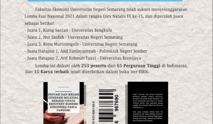 In order to enliven the anniversary, the Faculty of Economics has successfully held a National Essay Competition for students throughout Indonesia. The pandemic condition does not make you unproductive in your work. This is proven by the enthusiasm of young Indonesian scholars in their contribution...Read More