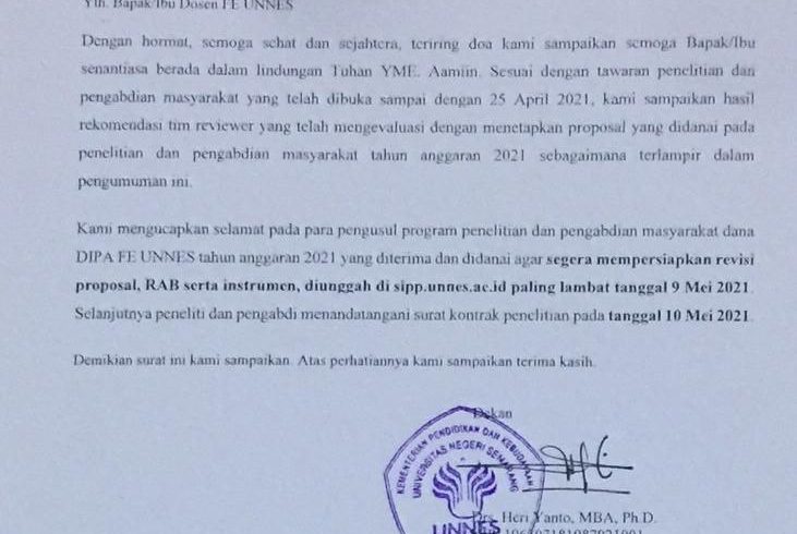 In accordance with the offer of research and community service which has been opened until April 25, 2021, we convey the recommendations of the reviewer team who have evaluated it by setting a funded proposal for research and community service in the 2021 budget year...Read More