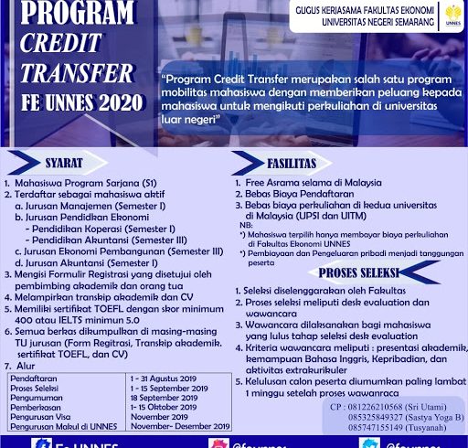 The Faculty of Economics, State University of Semarang has held a selection for students who will take part in Credit Transfer to Malaysia in the Even semester of 2020 at UiTM Melaka and UPSI. A number of students from the Department of Management, Economic Education,...Read More