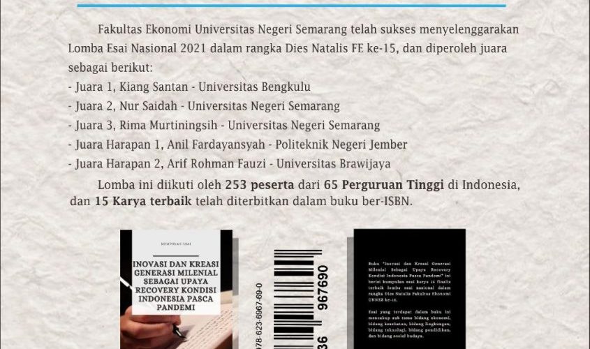 In order to enliven the anniversary, the Faculty of Economics has successfully held a National Essay Competition for students throughout Indonesia. The pandemic condition does not make you unproductive in your work. This is proven by the enthusiasm of young Indonesian scholars in their contribution to registering for this National Essay Competition. The essay competition, which was held with 6 types of sub-themes, was successful in getting 253 participants from...Read More