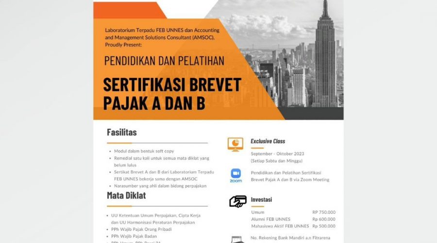 FEB UNNES Integrated Laboratory and Accounting and Management Solutions Consultant (AMSOC) will hold Tax Brevet A and B Certification. Training will be held every Saturday and Sunday from September – October 2023 online (Zoom Meeting). The following facilities will be obtained: 1. Module in soft copy form. 2. One-time remediation for all training courses that have not been passed. 3. Brevet A and B certificates from the FEB UNNES Integrated...Read More