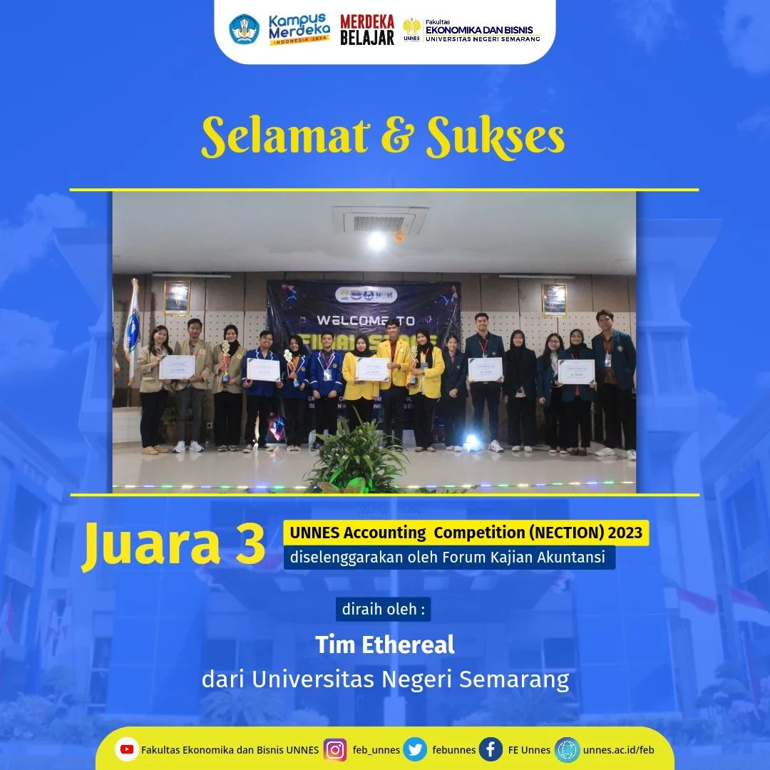 Tim Ethereal dari Fakultas Ekonomika dan Bisnis Universitas Negeri Semarang berhasil meraih Juara 3 dalam “Accounting Competition (NECTION) 2023” yang diselenggarakan oleh Forum Kajian Akuntansi (FOKUS) Secara luring. Daftar lengkap juara: Juara 1 : Tim Infinity dari Universitas Gajah Mada Juara 2 : Tim Lumba – Lumba dari PKN STAN Juara 3 : Tim Ethereal dari...Read More