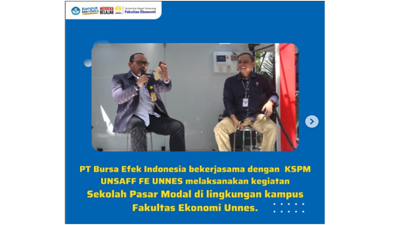 Fakultas Ekonomi sukses selenggarakan sekolah pasar modal keliling ( 21/11). Sekolah Pasar Modal (SPM) dan Sekolah Pasar Modal Syariah (SPMS) adalah program edukasi dan sosialisasi pasar modal yang diselenggarakan secara berkala oleh Bursa Efek Indonesia (BEI). Seluruh masyarakat umum dapat menjadi peserta SPM dan SPMS sepanjang telah melakukan pendaftaran sesuai dengan syarat dan ketentuan yang berlaku.