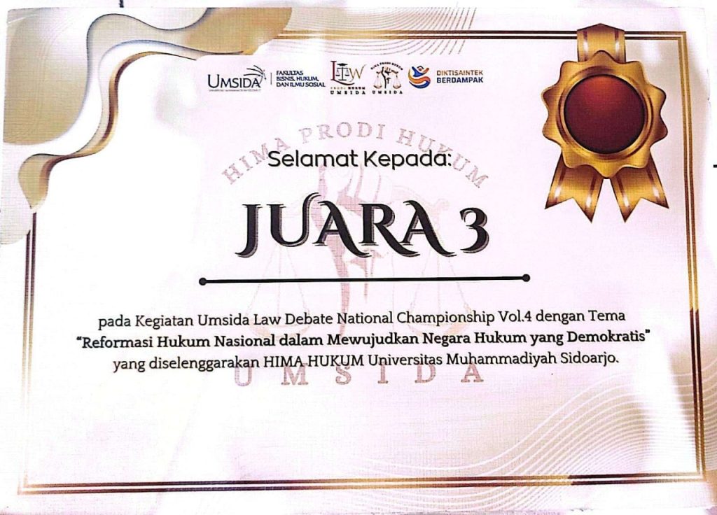 Dalam ajang bergengsi ini, tim debat FH UNNES yang beranggotakan Fanisa Mutiatun Ngilmiah (2308010487), Rifka Lolyana Oktavia Sitorus (2308010062), dan Ariel Jhonson Turnip (2408010513) berhasil meraih Juara 3 berkat kemampuan argumentasi hukum yang tajam, pemahaman isu yang mendalam, serta strategi debat yang solid. Keberhasilan ini tidak lepas dari dukungan tim riset yang turut berkontribusi besar dalam menyiapkan materi dan analisis, yakni Restu Putri (2023), Beth Anastasia (2023), Sintya Setia (2023), Budiman Sugiarto (2023), Marta Syifa (2024), dan Nathania Tesamonika (2024).