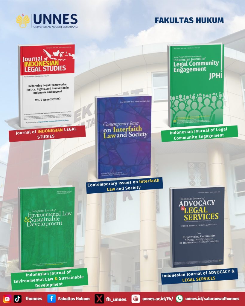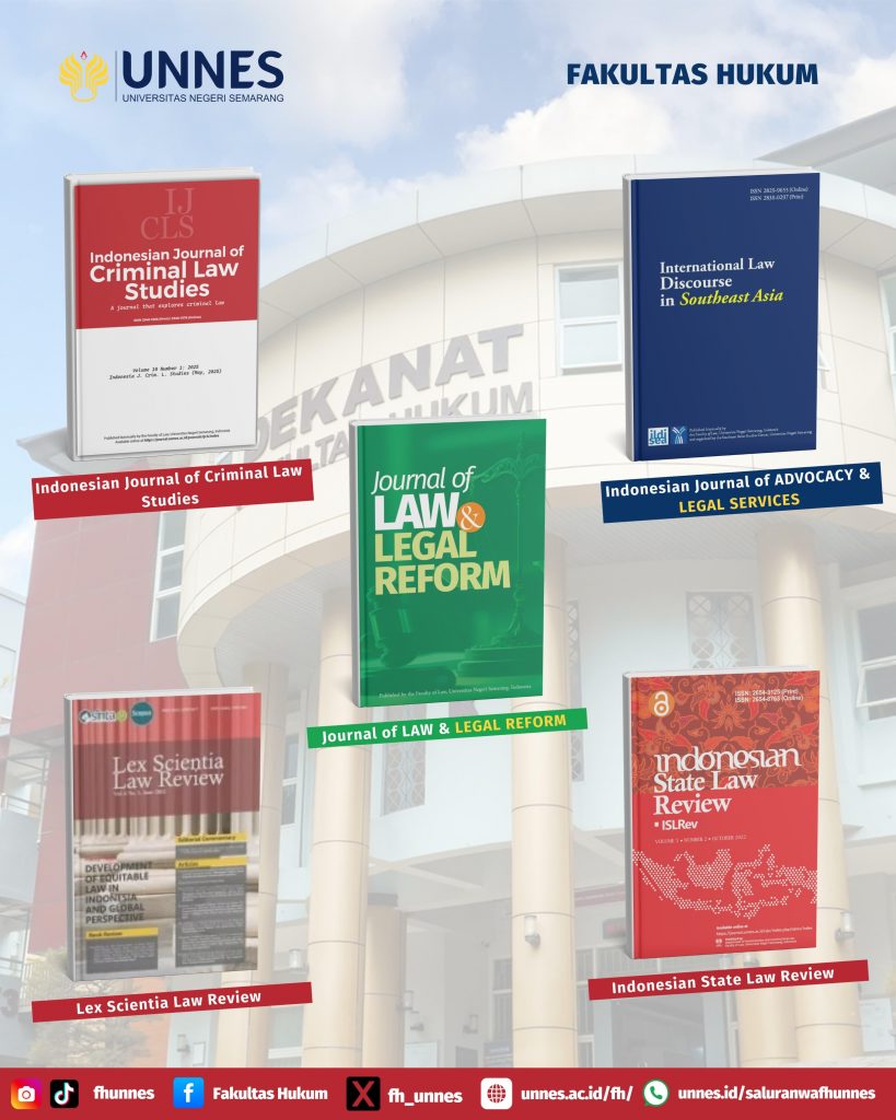 - Journal of Law and Legal Reform, yang dikelola oleh Dr. Indah Sri Utari, S.H., M.Hum. sebagai Editor in Chief, dengan Dr. Anis Widyawati, S.H., M.H. dan Dina Silvia Puteri, S.H., M.Kn., LL.M. sebagai Editor Section.