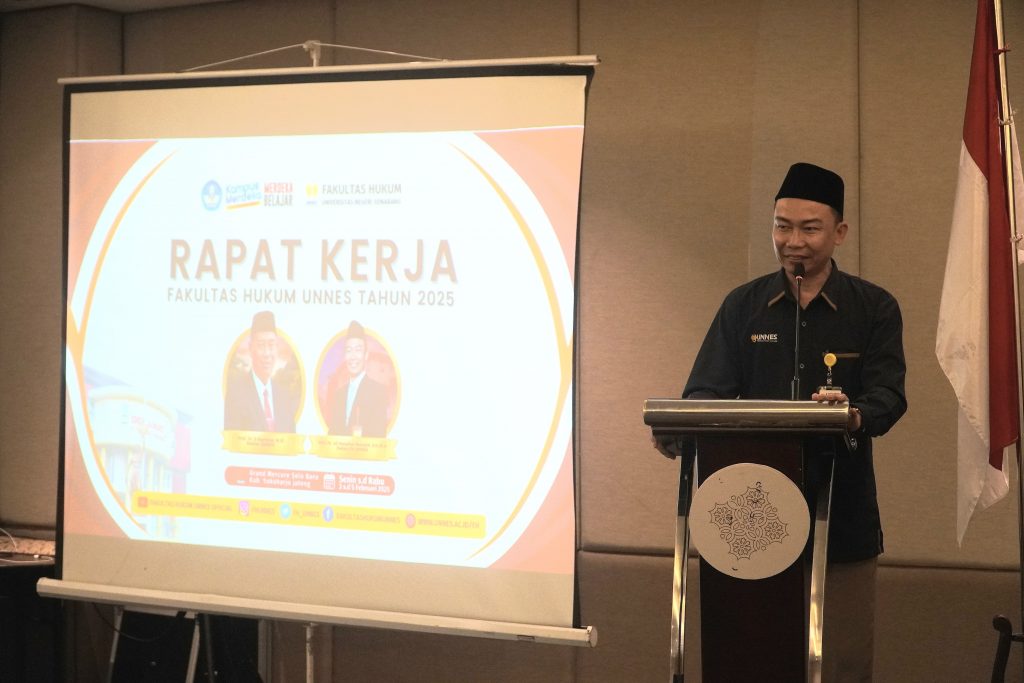 Dekan FH UNNES, Prof. Dr. Ali Masyhar Mursyid, S.H., M.H., dalam paparannya menegaskan bahwa rapat kerja ini menjadi momentum penting dalam memperkuat visi fakultas sebagai institusi hukum yang berdaya saing tinggi.