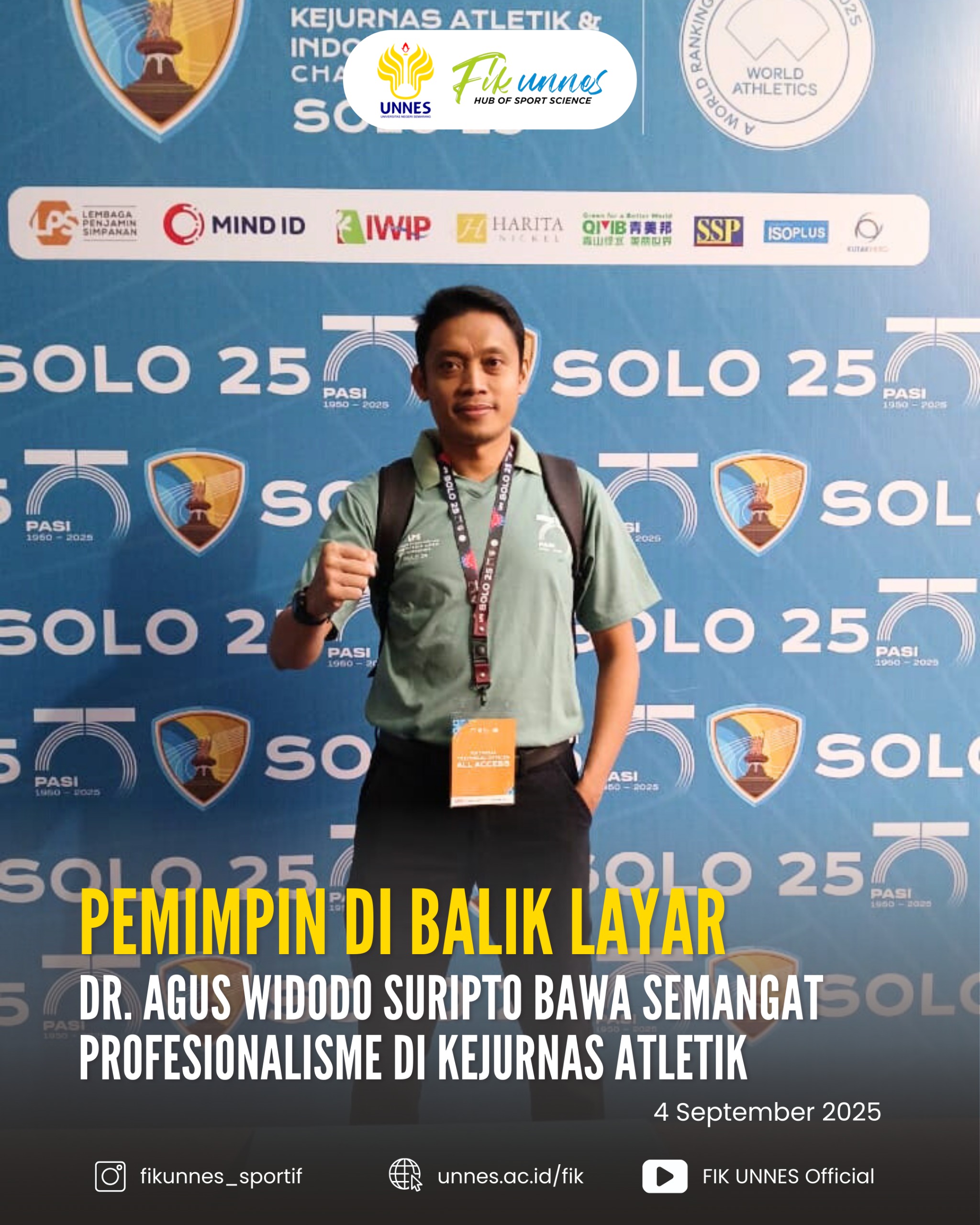 Kejuaraan Nasional Atletik dan Indonesia Open 2025 yang digelar di Stadion Sriwedari, Surakarta, pada awal September 2025 berlangsung dengan sukses. Di balik kelancaran acara yang melibatkan para atlet dari berbagai daerah ini, terdapat peran penting seorang akademisi yang turut memberikan kontribusi nyata. Dr. Agus Widodo Suripto, S.Pd., M.Pd., Dosen sekaligus Koordinator Program Studi Pendidikan Jasmani...