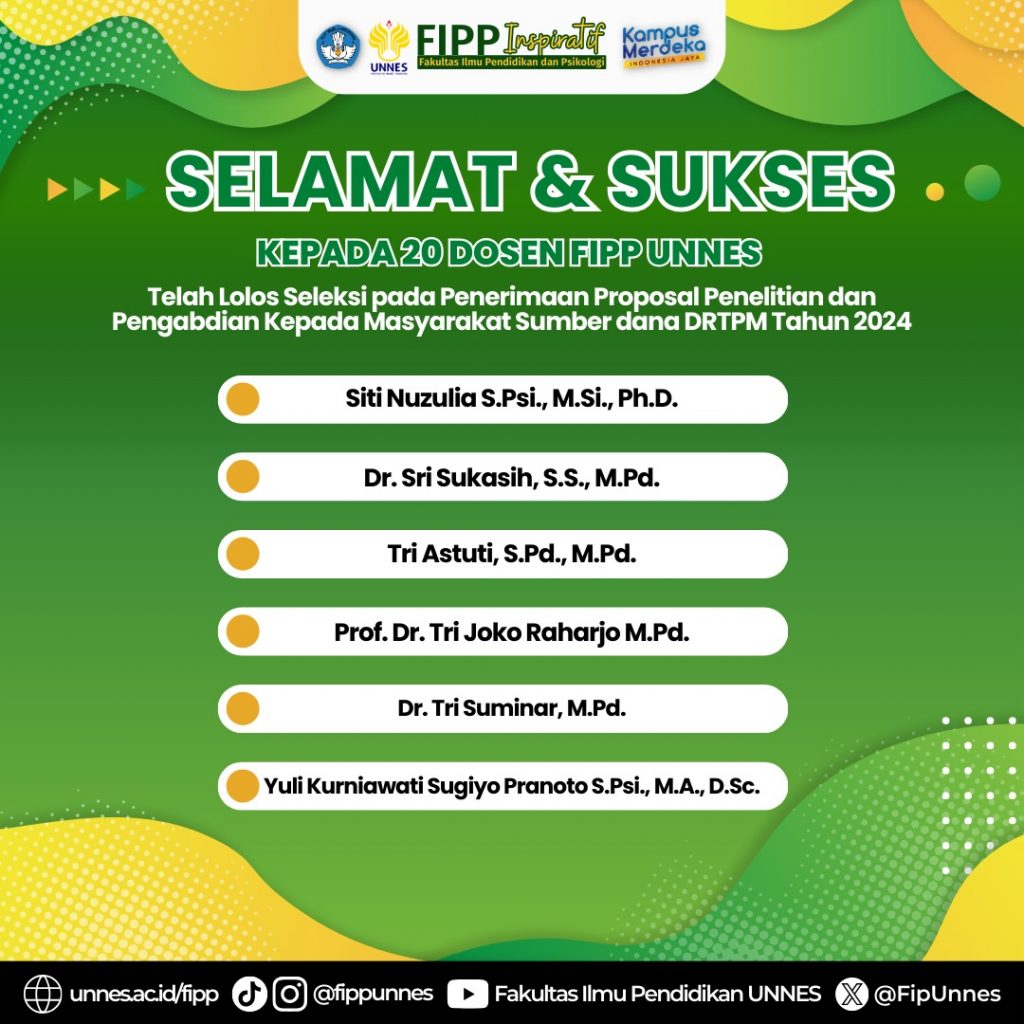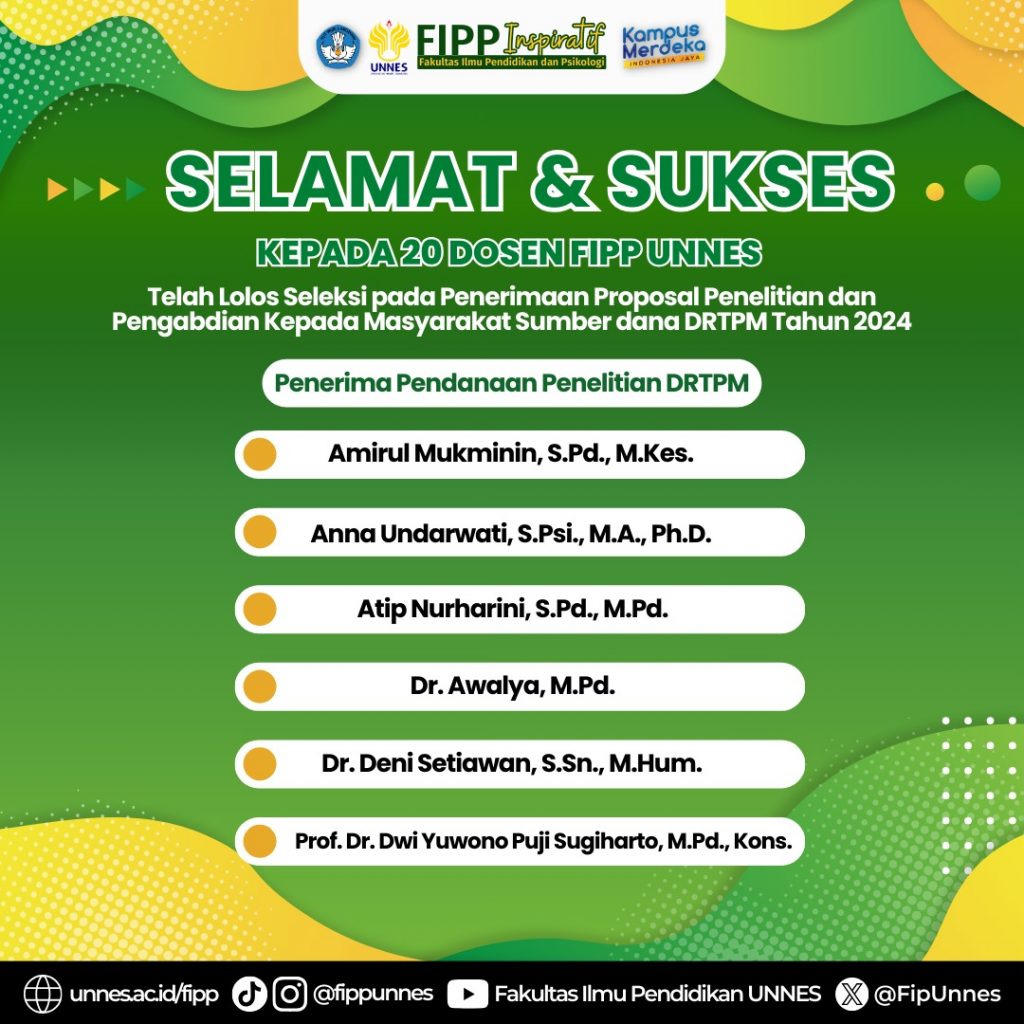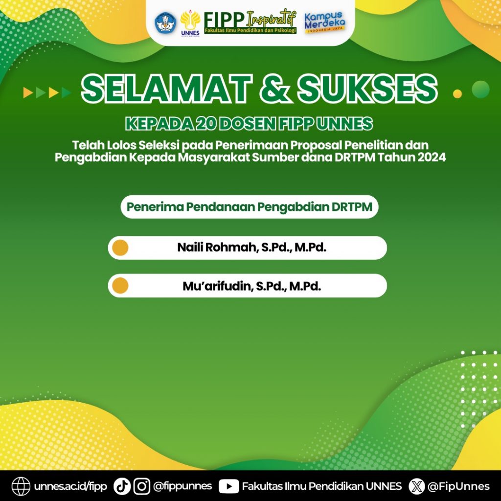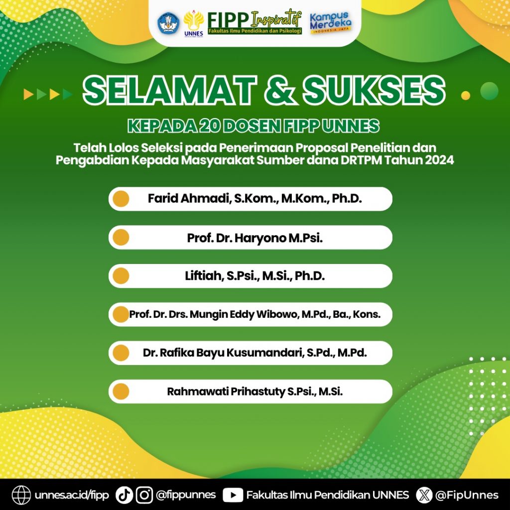 Selamat atas terpilihnya 20 dosen FIPP UNNES yang telah lolos seleksi pada penerimaan proposal penelitian dan pengabdian kepada masyarakat dengan sumber dana DRTPM Tahun 2024.