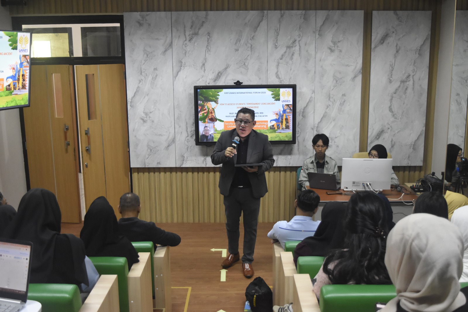 Melengkapi perspektif teknologi, Guru Besar FIPP UNNES, Prof. Dr. Purwo Susongko, M.Pd., membawa diskusi kembali ke akar budaya. Melalui presentasi berjudul “How to Assess Students’ Temperament Using Ancient Javanese Knowledge”, ia menjelaskan bagaimana kearifan lokal Jawa dapat menjadi instrumen krusial bagi guru dalam merancang intervensi pendidikan karakter yang efektif.
