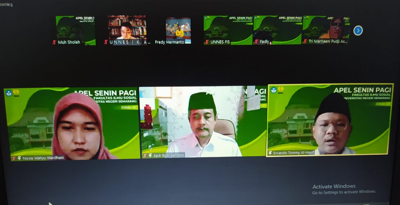 Hal tersebut disampaikan oleh Dr Apik Budi Santoso, Wakil Dekan Bidang Umum dan Keuangan FIS UNNES pada saat menjadi pembina apel senin pagi, tanggal 18 Oktober 2021 yang dilaksanakan secara virtual menggunakan fasilitas zoom meeting.