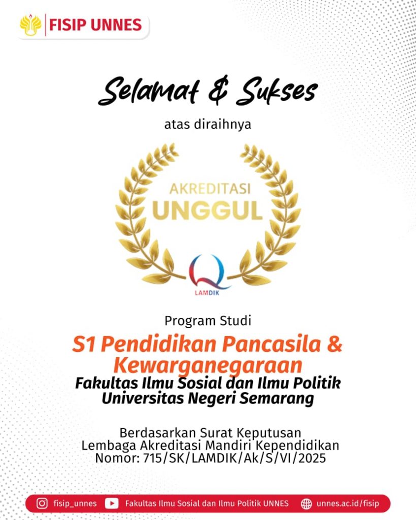 Program Studi (Prodi) Pendidikan Pancasila dan Kewarganegaraan (PPKn) FISIP UNNES meraih akreditasi unggul. Hasil tersebut diumumkan melalui situs web Lembaga Akreditasi Mandiri Kependidikan (LAMDIK) pada Selasa, 10 Juni 2025.