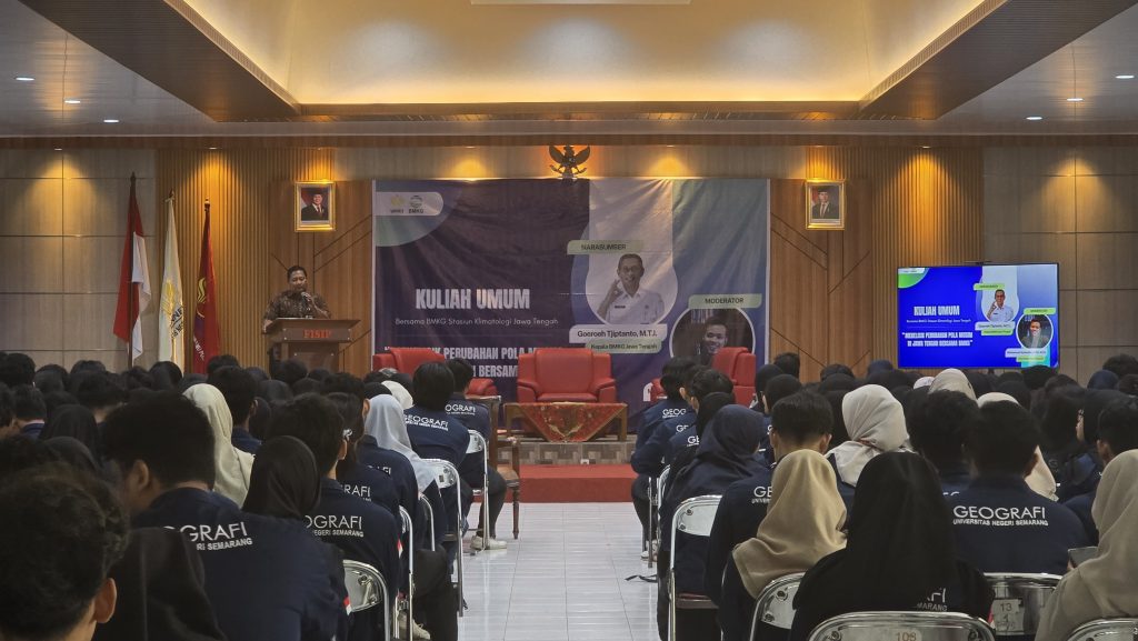 Semarang, 25 Juni 2025 — Dalam rangka memperkaya wawasan mahasiswa tentang dinamika iklim dan memperkuat pemahaman akademik di bidang klimatologi, Keluarga Mahasiswa (KM) Geografi Universitas Negeri Semarang (UNNES) menyelenggarakan Kuliah Umum bertema “Menelisik Perubahan Pola Musim di Jawa Tengah”. Kegiatan ini berlangsung di Gedung C7 Lantai 3 FISIP UNNES, menghadirkan Bapak Goeroeh Tjiptanto, M.T., selaku Kepala Stasiun Klimatologi BMKG Jawa Tengah, serta dihadiri oleh para dosen Geografi dan mahasiswa dari berbagai angkatan.