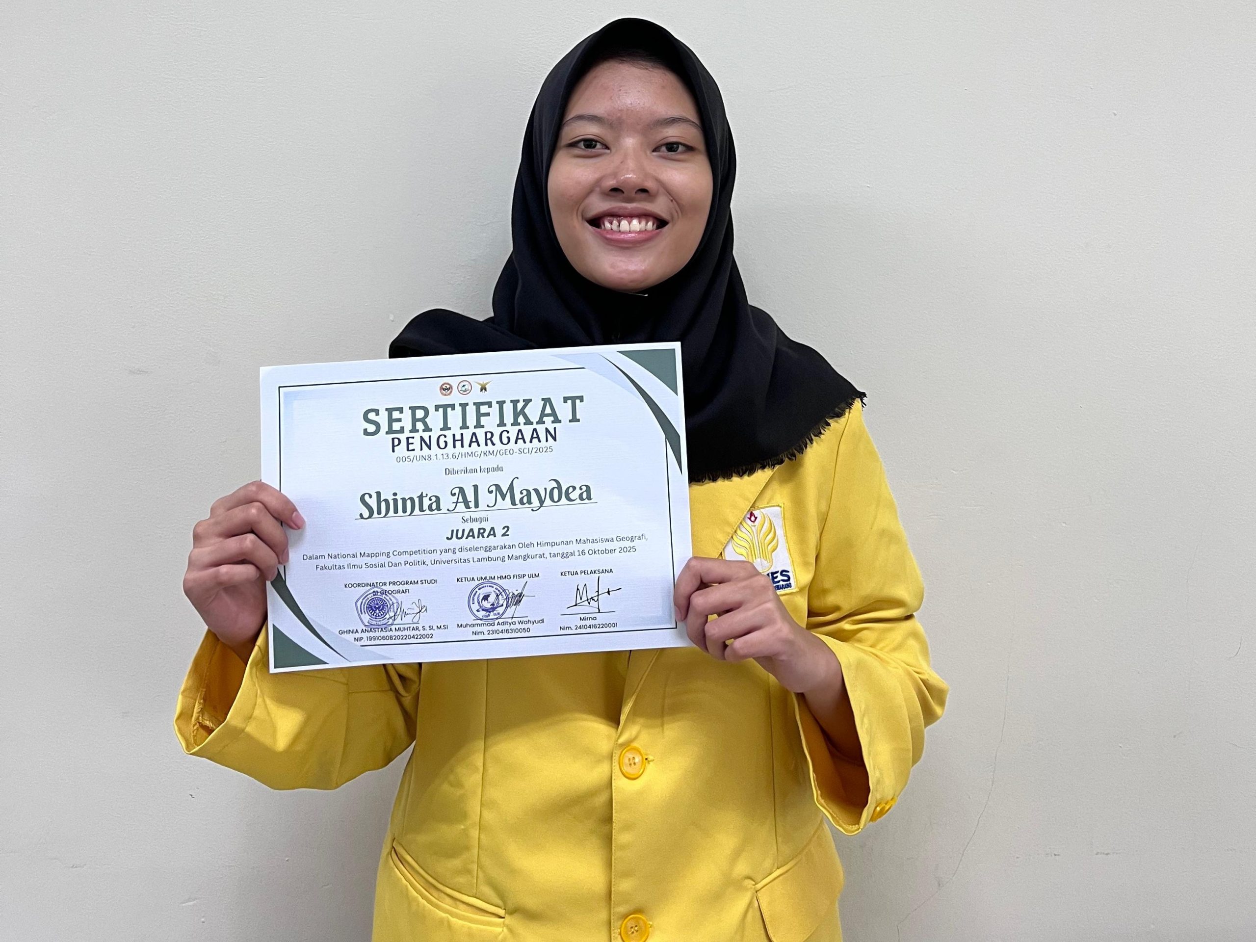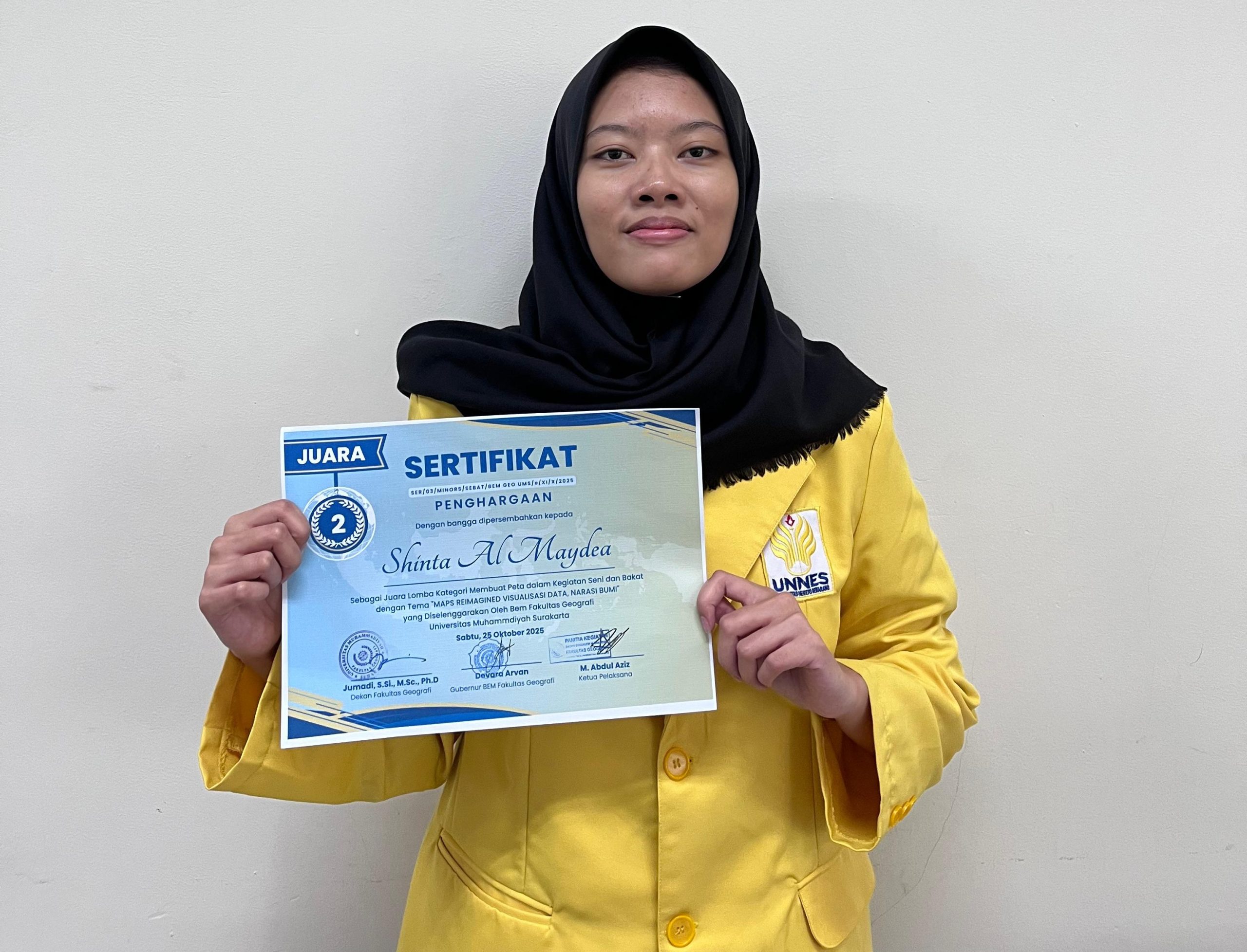 Another proud achievement has been recorded by a student from Universitas Negeri Semarang (UNNES). Shinta Al Maydea (2303040138), a student of the Geography Study Program, FISIP UNNES, earned an outstanding accomplishment at the arts and talent event themed “MAPS REIMAGINED: Data Visualization, Earth Narratives”, organized by the Student Executive Board (BEM) of the Faculty of...