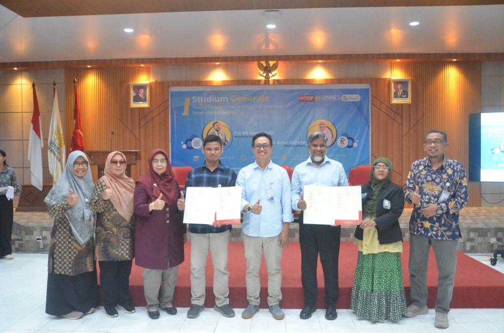 The event also included the signing of a Memorandum of Understanding (MoU) between FISIP UNNES, Bangladesh Agricultural University, and Ritsumeikan University. The agreement was represented by the Vice Dean II of FISIP UNNES, Dr.scient.med. Fadly Husain, S.Sos., M.Si.
