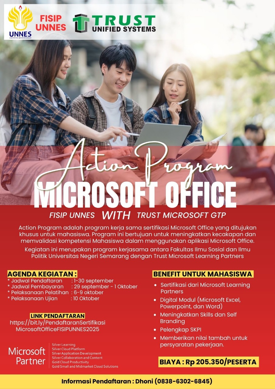 https://bit.ly/PendaftaranSertifikasiMicrosoftOfficeFISIPUNNES2025 Action Program adalah kerja sama sertifikasi Microsoft Office yang ditujukan khusus untuk mahasiswa. Program ini bertujuan untuk meningkatkan kecakapan dan memvalidasi kompetensi mahasiswa dalam menggunakan aplikasi Microsoft Office. Kegiatan ini merupakan program kerjasama antara Fakultas Ilmu Sosial dan Ilmu Politik Universitas Negeri Semarang dengan Trust Microsoft Learning Partners.