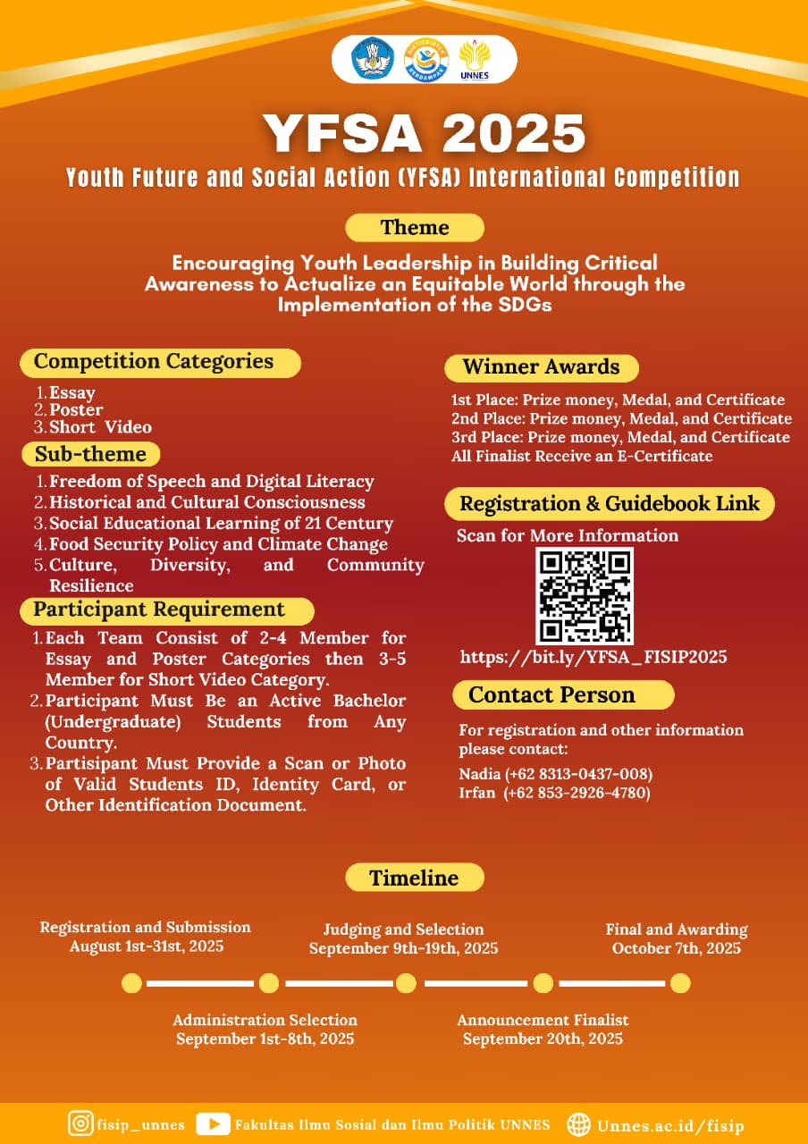 Hey, Future Leaders! 👋🏻Great news for those of you who crave challenges, are full of ideas, and ready to take action for change! 🌍‼️YFSA COMPETITION 2025‼️ is here as a international platform for you to show your concern and contribution to global social issues! 🔍 Theme:Encouraging youth leadership in building critical awareness to actualize an...
