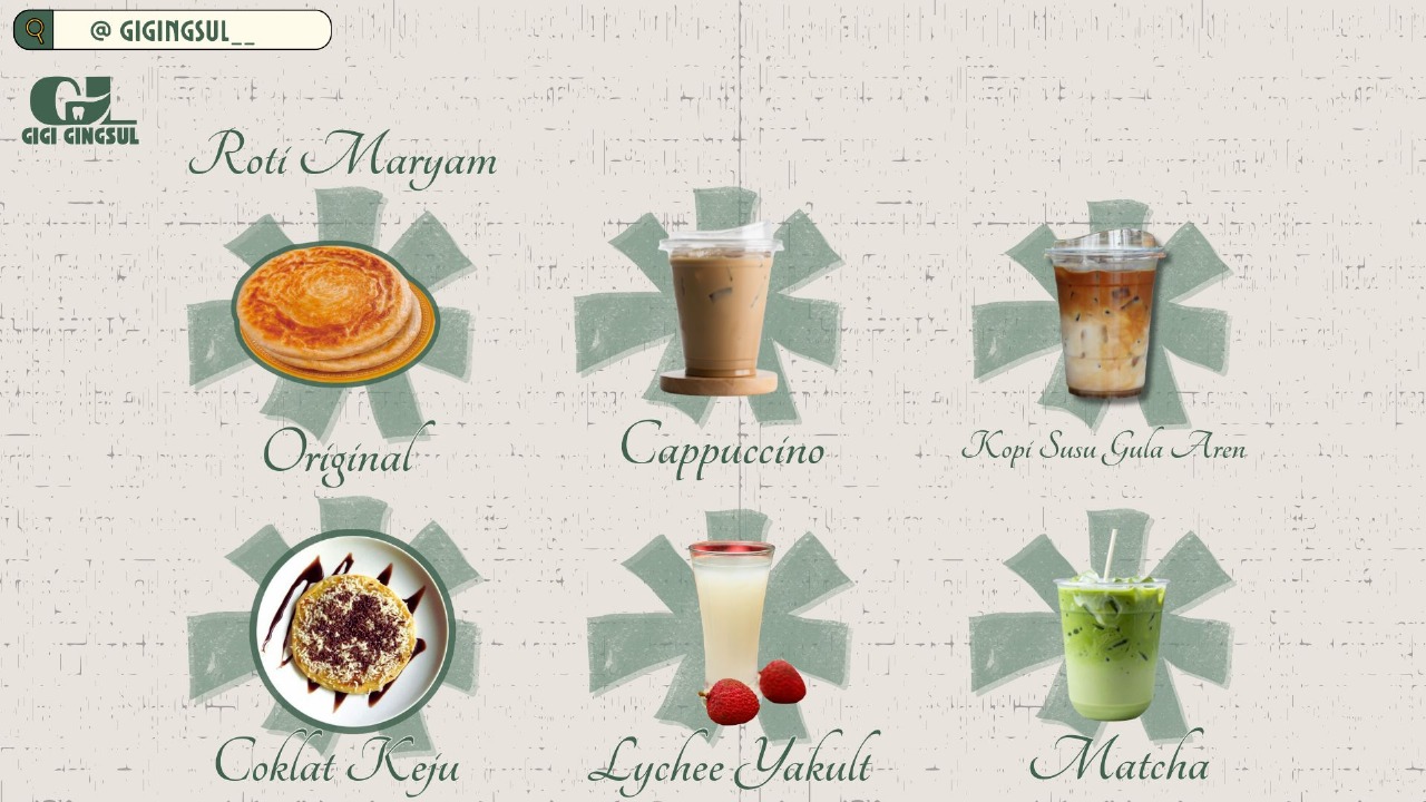 Dalam gelaran Expo besok, Gigi Gingsul menyiapkan 35 buah roti maryam dan 75 cup minuman, terdiri dari kopi susu gula aren (15 cup), cappuccino (15 cup), matcha (20 cup), dan lychee yakult (25 cup). Harga roti maryam dibanderol Rp5.000 untuk varian original, Rp7.000 untuk rasa keju cokelat, dan Rp10.000 untuk varian gula aren serta matcha.