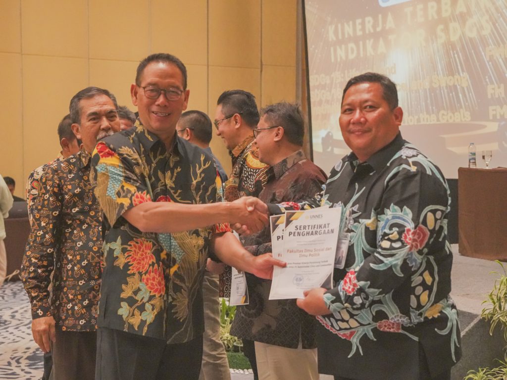 Dalam forum tersebut, FISIP UNNES yang diwakili oleh Dekan, Prof. Dr. Arif Purnomo, S.Pd., S.S., M.Pd., berhasil meraih tiga penghargaan sekaligus. Penghargaan tersebut meliputi Prestasi Capaian Kinerja Terbaik III pada Indikator Kinerja Utama, Prestasi Best Citation per Paper pada Indikator World Class University, serta Prestasi Kinerja Pendukung Terbaik pada SDGs 11: Sustainable Cities and Communities. Tiga capaian ini menegaskan konsistensi FISIP dalam mendukung visi UNNES sebagai kampus bereputasi internasional yang berorientasi pada inovasi dan keberlanjutan.