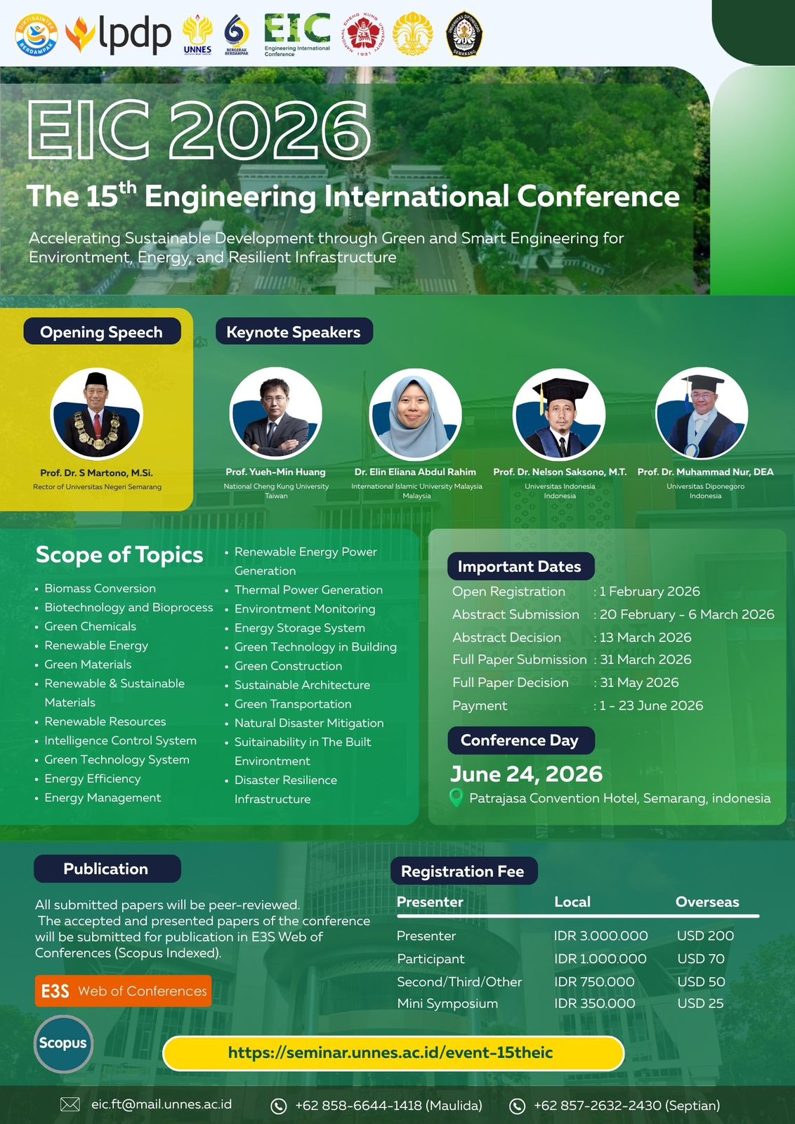 We are pleased to invite researchers, academics, professionals, industry practitioners, policymakers, and students to participate in EIC 2026, an international forum organized by the Faculty of Engineering, Universitas Negeri Semarang.