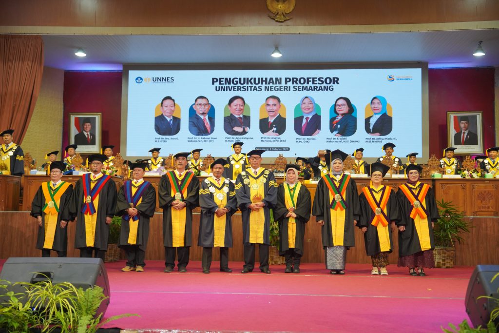 Pengukuhan 7 Profesor Universitas Negeri Semarang pada 2 oktober 2025 di gedung Auditorium Prof. Wuryanto UNNES berlangsung khidmat ini dihadiri Ketua, Sekretaris, dan Anggota Senat Akademik UNNES, Komisi Profesor, para Wakil Rektor, Ketua Lembaga, Dekan, Direktur Pascasarjana, Wakil Dekan, serta sivitas akademika. Turut hadir keluarga para profesor dan tamu undangan lainnya.