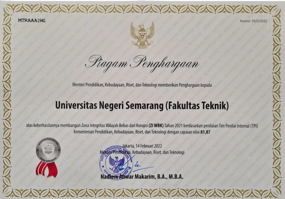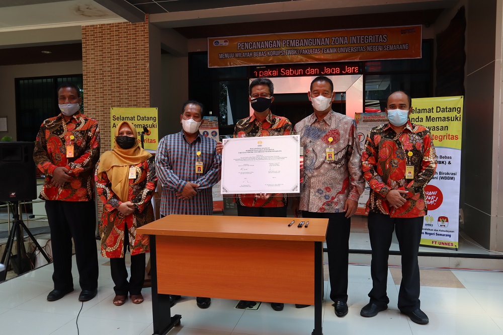 Pada hari Selasa, 27 April 2021. Fakultas Teknik Universitas Negeri Semarang (UNNES) mengadakan kegiatan Pencanangan Pembangunan Zona Integritas Menuju Wilayah Bebas Korupsi (WBK). Acara ini dihadiri oleh Rektor Universitas Negeri Semarang (UNNES) Prof. Dr. Fathur Rokhman., M.Hum bersama semua Wakil Rektor, Direktur Pasca Sarjana, Dekan di lingkungan UNNES, Ketua Lembaga, Ketua Jurusan, Tim Pembangunan Zona Integritas FT, Dosen, Tendik dan Mahasiswa. Acara diadakan secara daring dan luring terbatas dengan protokol kesehatan ketat.