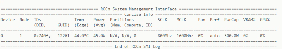 keterangan: perintah diatas akan menggunakan semua GPU yang ada sebagai referensi, dan dieksekusi dalam environment image bawaan dari AMD ROCm yaitu rocm/rocm-terminal, dan aplikasi/tool yang dieksekusi adalah rocm-smi.