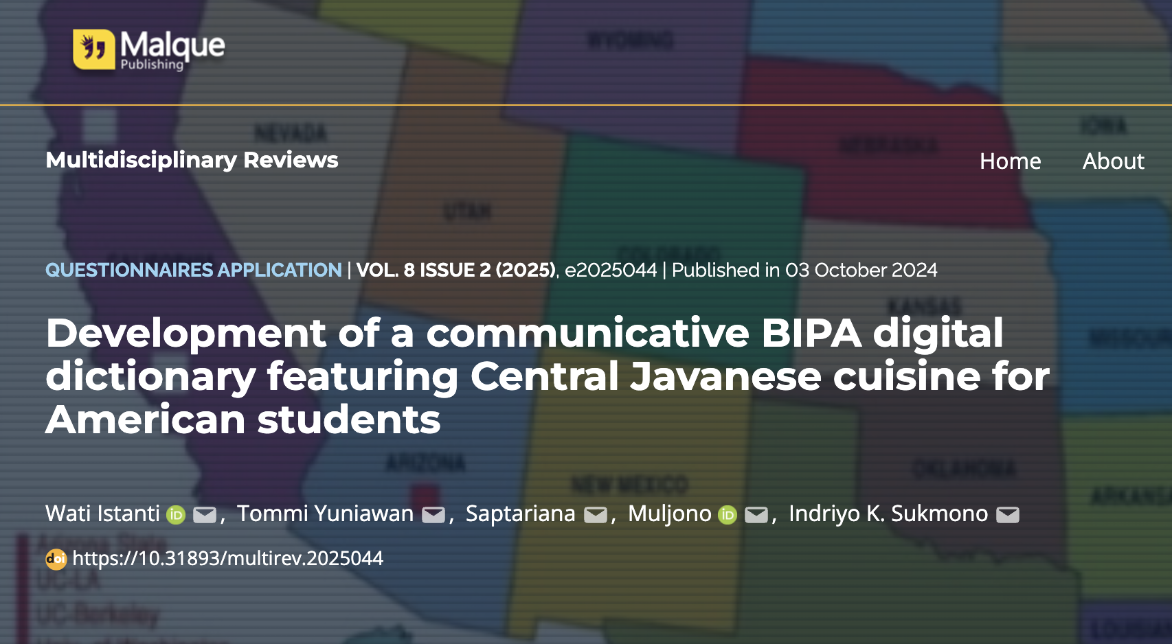 Dalam upaya meningkatkan pemahaman budaya dan penguasaan bahasa Indonesia bagi penutur asing, sebuah inovasi berupa kamus digital kuliner tradisional Jawa Tengah dikembangkan secara khusus untuk mahasiswa Amerika Serikat. Studi terbaru yang ditulis oleh dosen Fakultas Bahasa dan Seni UNNES, Wati Istanti, dalam jurnal Multidisciplinary Reviews ini mengungkapkan bahwa kamus digital berbasis BIPA (Bahasa Indonesia bagi...