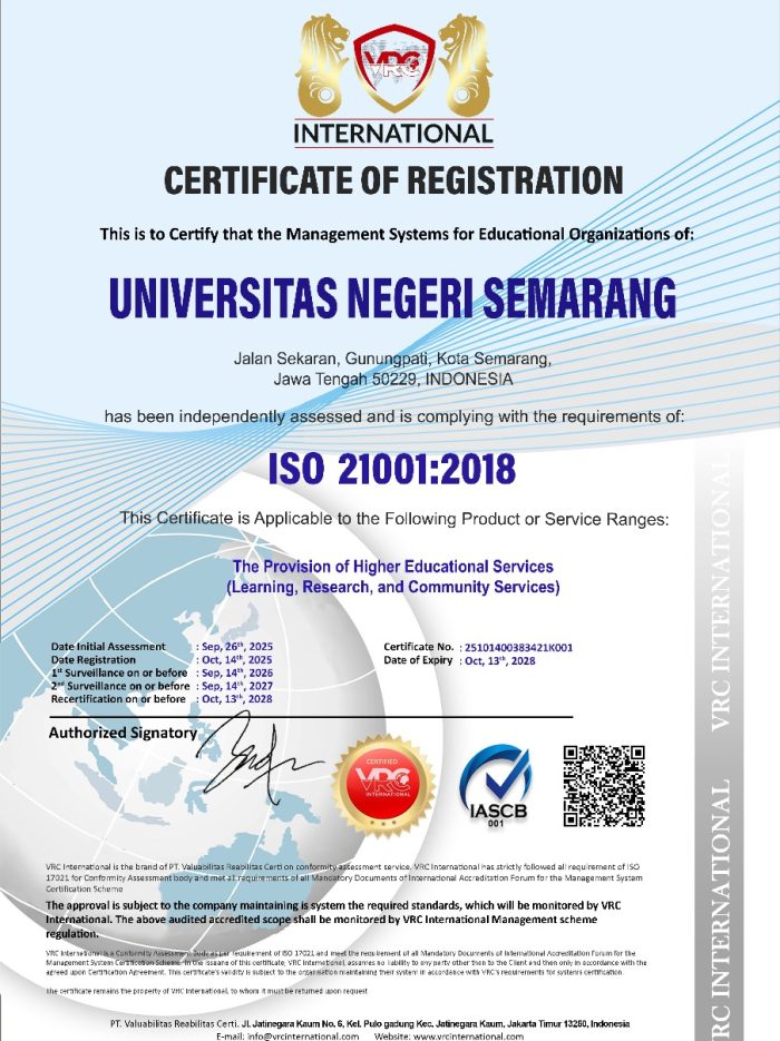 Universitas Negeri Semarang (UNNES) telah meraih sertifikat ISO 21001:2018 untuk layanan pendidikan tinggi dengan masa berlaku hingga 13 Oktober 2028 sebagai wujud nyata menerapkan sistem manajemen pendidikan yang efektif, transparan, dan berorientasi pada kepuasan pemangku kepentingan.