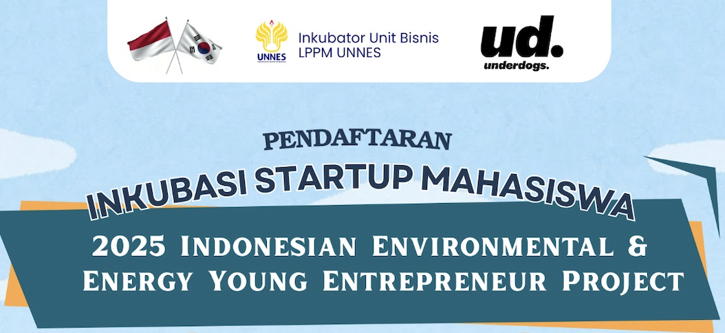 Pendaftaran inkubasi Startup Mahasiswa S1/S2 dalam Ajang “2025 Indonesian Environmental & Energy Young Entrepreneur Project”. Kerjasama Inkubator Unit Bisnis LPPM UNNES dengan underdogs. Korea Pendaftaran: 11 – 31 Agustus 2025https://bit.ly/startup-iub-korea NarahubungNaswa (https://wa.me/+6283865005131)