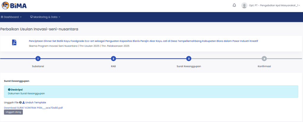 • Tangkapan layar (screenshot) laman BIMA yang menunjukkan bukti unggah revisi proposal dan surat kesanggupan (masing-masing 1 rangkap);