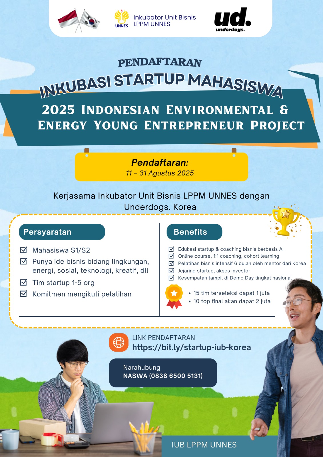 Pendaftaran inkubasi Startup Mahasiswa S1/S2 dalam Ajang “2025 Indonesian Environmental & Energy Young Entrepreneur Project”. Kerjasama Inkubator Unit Bisnis LPPM UNNES dengan underdogs. Korea