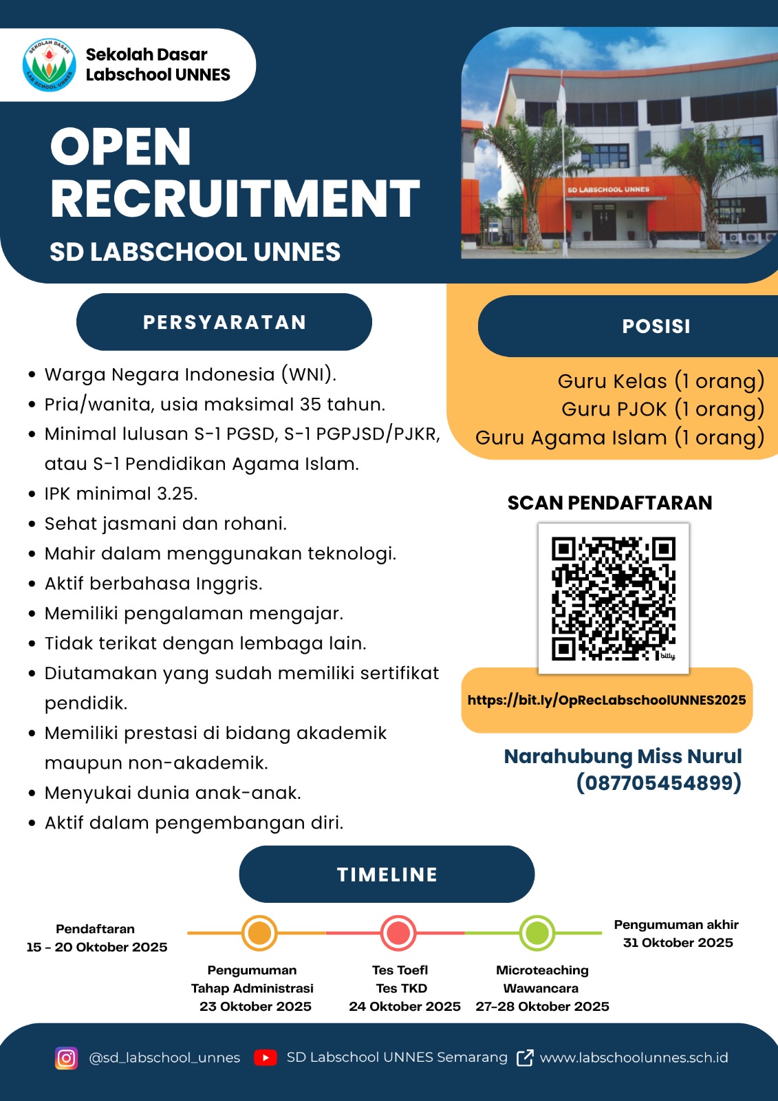 Formasi: Guru Kelas (1), Guru Olahraga/PJOK (1), Guru Pendidikan Agama Islam (1)Lokasi: SD Labschool UNNES, Jl. Menoreh Tengah X No. 4 Semarang, Jawa TengahPeriode Pendaftaran: 15–20 Oktober 2025 Profil Singkat SD Labschool UNNES berkomitmen menjadi pelopor kecemerlangan pendidikan dengan melahirkan insan cerdas multitalenta. Kualifikasi Umum WNI bertaqwa kepada Tuhan YME Usia 20–35 tahun Tidak berstatus...