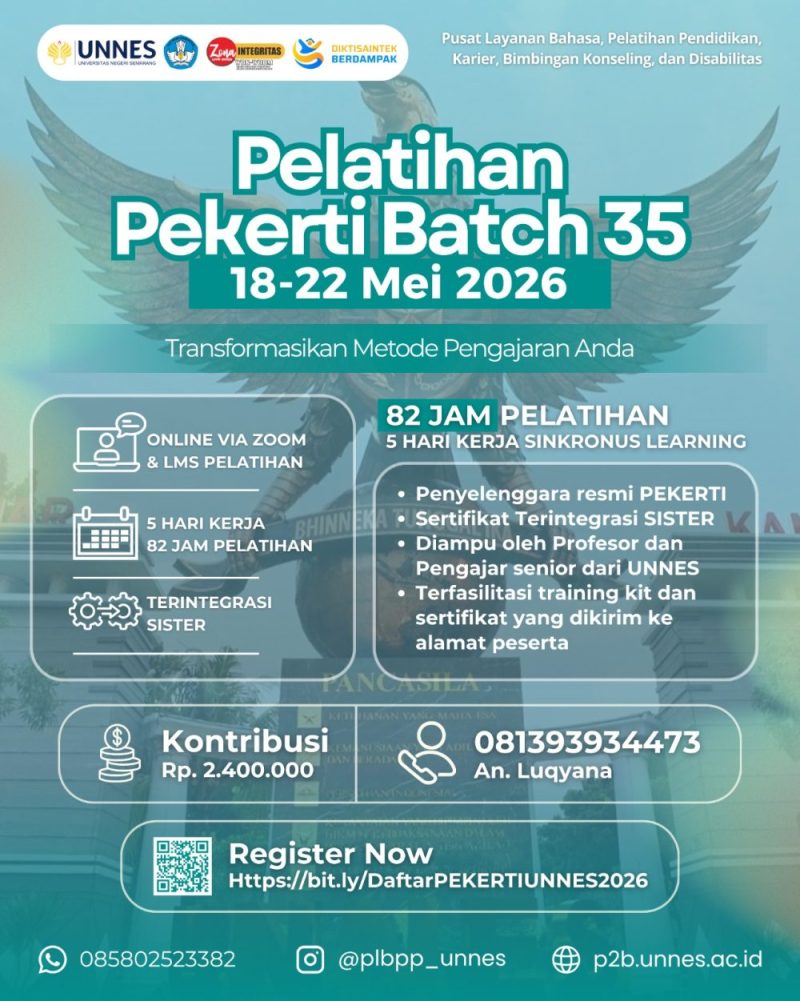 Universitas Negeri Semarang kembali menyelenggarakan Pelatihan PEKERTI (Peningkatan Keterampilan Dasar Teknik Instruksional) Batch 35, yang diperuntukkan bagi dosen luar UNNES. Pelatihan ini dirancang secara sistematis dan aplikatif untuk memperkuat kemampuan dosen dalam merancang, melaksanakan, serta mengevaluasi proses pembelajaran yang efektif, inovatif, dan berpusat pada mahasiswa. Selain mendapatkan pembekalan materi yang komprehensif, peserta juga akan memperoleh...