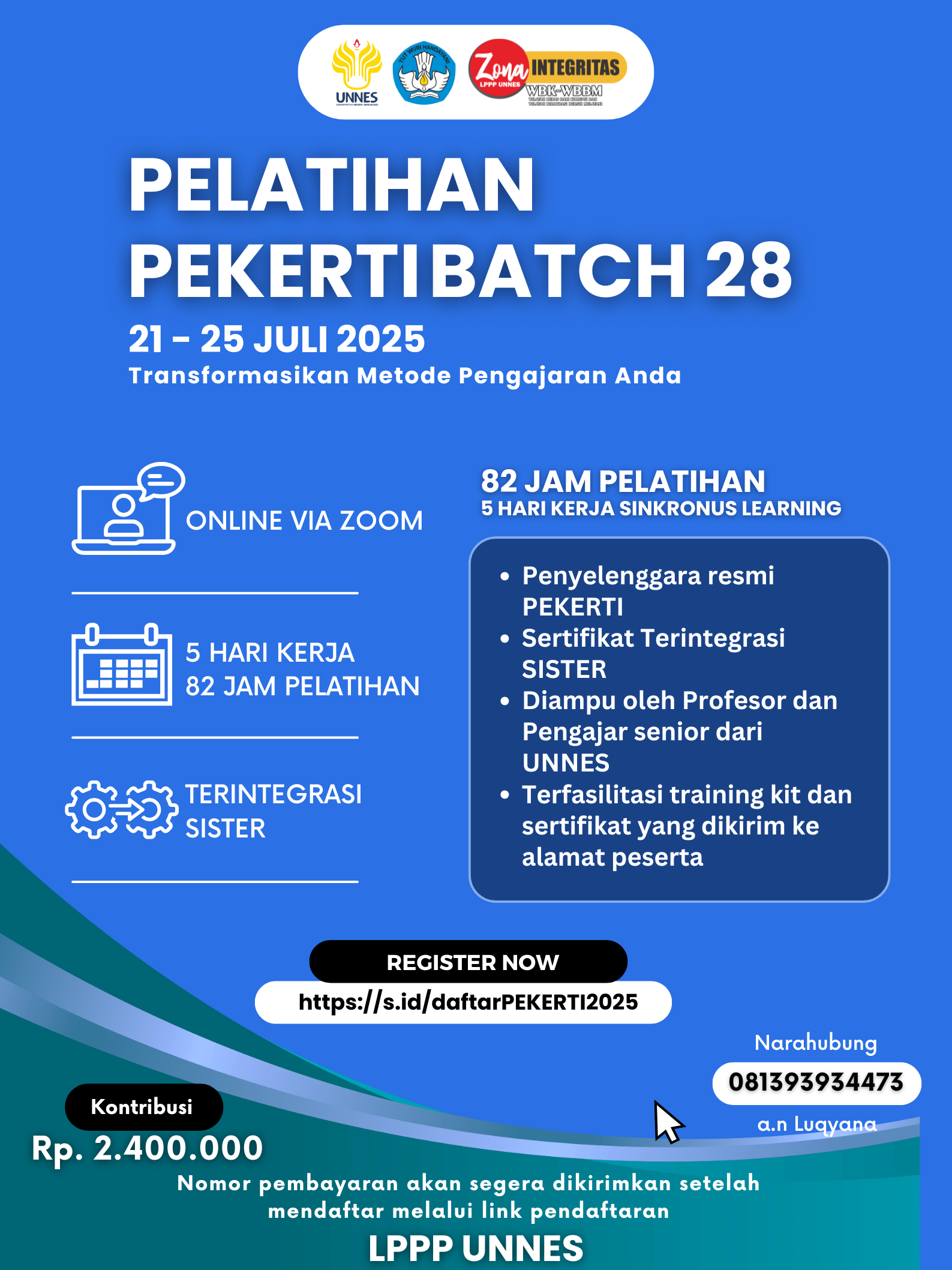 Pendaftaran Pelatihan PEKERTI Batch 28 Telah Dibuka! Lembaga Pengembangan Pendidikan dan Profesi (LPPP) Universitas Negeri Semarang dengan bangga membuka Pelatihan PEKERTI Batch 28 sebagai bagian dari program peningkatan kapasitas dosen dan tenaga pendidik di seluruh Indonesia. 🗓 Pelaksanaan:21–25 Juli 2025📍 Modus: Daring melalui Zoom Meeting & LMS Pelatihan LPPP UNNES Pelatihan ini dirancang untuk memperkuat...