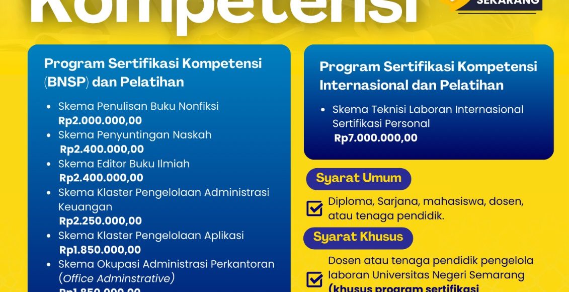 Lembaga Sertifikasi Profesi (LSP) UNNES bekerja sama dengan Badan Nasional Sertifikasi Profesi (BNSP) membuka kesempatan...