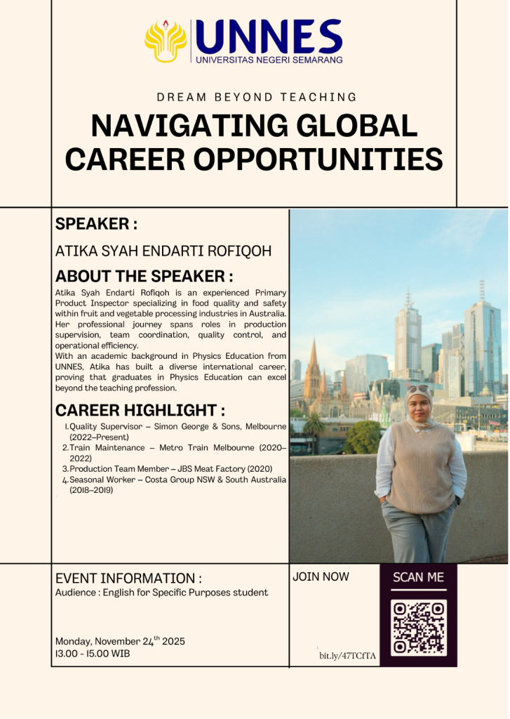 The invited practitioner, Atika Syah Endarti Rofiqoh, is an alumna of UNNES Physics Education, currently working as a Primary Product Inspector and Quality Supervisor in the horticultural processing industry in Melbourne, Australia. Through a session themed “Navigating Global Career Opportunities,” Atika shared her international career journey and demonstrated how English proficiency can open doors to overseas employment opportunities.