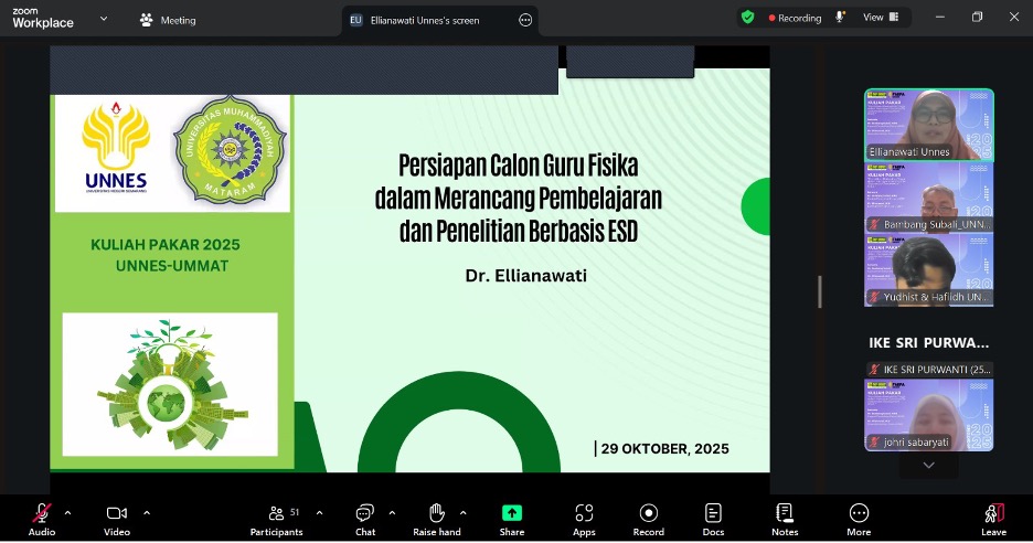 Semarang and Mataram, October 29, 2025 — The Physics Education Study Program of Universitas Negeri Semarang (UNNES) in collaboration with the Physics Education Study Program of Universitas Muhammadiyah Mataram (UMMAT) successfully held an Expert Lecture titled “Quality Education as a Pillar of Sustainable Development.” The event was conducted online via Zoom on Wednesday, October 29,...