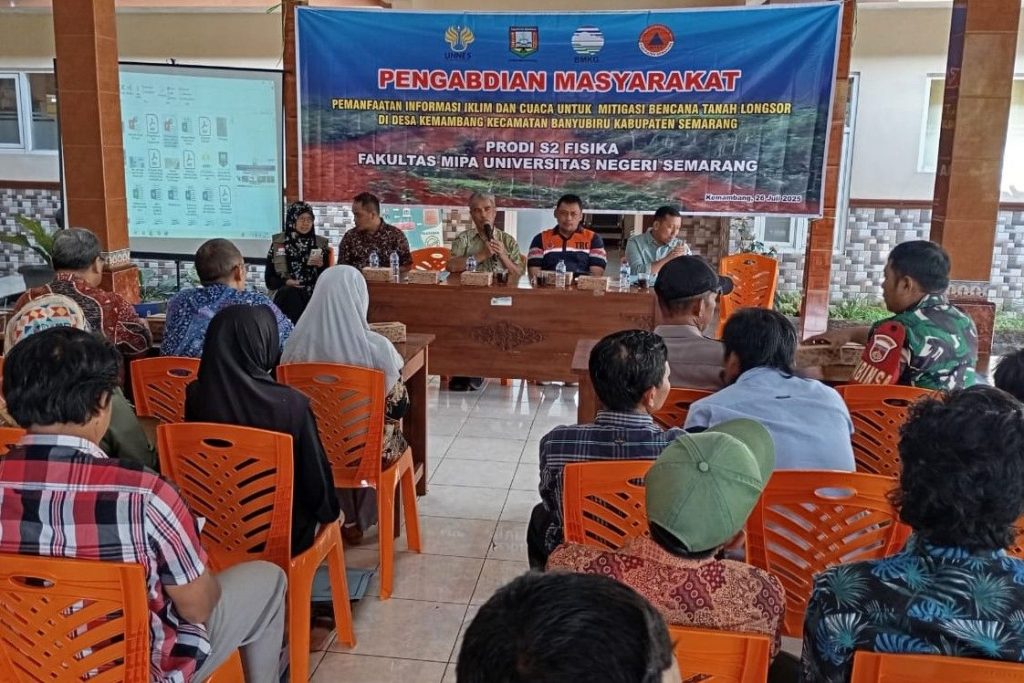 Tim pengabdian kepada masyarakat dari Fakultas Matematika Ilmu Pengetahuan Alam (MIPA) Universitas Negeri Semarang (Unnes) mengedukasi warga Desa Kemambang, Kecamatan Banyubiru, Kabupaten Semarang, Sabtu (26/7/2025). Bersama Badan Meteorologi Klimatologi dan Geofisika Jateng, Unnes memberikan pemahaman informasi cuaca dan iklim, termasuk mitigasi bencana di desa rawan longsor tersebut.