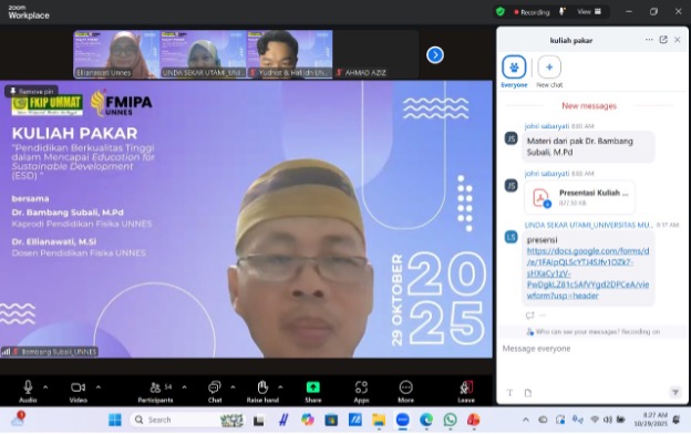 Semarang dan Mataram, 29 Oktober 2025 — Program Studi Pendidikan Fisika Universitas Negeri Semarang (UNNES) bekerja sama dengan Program Studi Pendidikan Fisika Universitas Muhammadiyah Mataram (UMMAT) sukses menyelenggarakan kegiatan Kuliah Pakar bertema “Pendidikan Berkualitas Tinggi sebagai Pilar Pembangunan Berkelanjutan.” Kegiatan ini dilaksanakan secara daring melalui platform Zoom pada Rabu, 29 Oktober 2025, pukul 07.30 WIB atau 08.30 WITA, dan diikuti oleh dosen serta mahasiswa dari kedua perguruan tinggi.