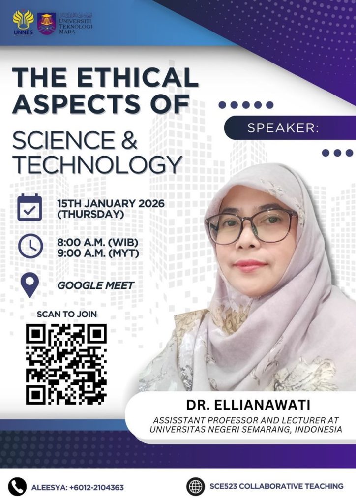 Pada Kamis, 15 Januari 2026, Dr. Ellianawati, dosen dan Assistant Professor Program Studi Pendidikan Fisika FMIPA UNNES, menyampaikan kuliah bertajuk “The Ethical Aspects of Science and Technology” secara daring melalui Google Meet pada pukul 08.00 WIB / 09.00 MYT. Materi yang disampaikan menyoroti isu-isu etika dalam pengembangan sains dan teknologi, termasuk tanggung jawab ilmuwan, implikasi moral inovasi teknologi, serta relevansi etika dalam pendidikan sains abad ke-21.