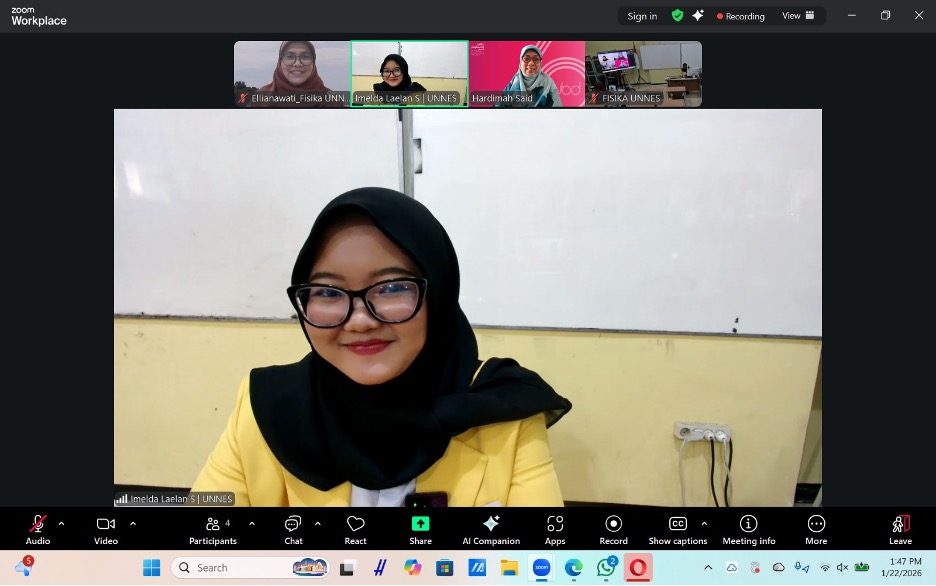 Fakultas Matematika dan Ilmu Pengetahuan Alam (FMIPA) Universitas Negeri Semarang (UNNES) telah melaksanakan ujian skripsi mahasiswa Program Studi Pendidikan Fisika atas nama Imelda Laelan Safina pada Kamis, 22 Januari 2026, pukul 13.00 WIB hingga selesai.