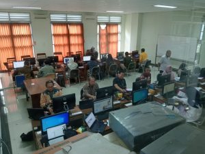 Ya, ujian PPG untuk Guru Tertentu tahap 3 dilaksanakan secara daring berbasis domisili. Peserta ujian berada di domisi masing-masing. Pengawas di kampus mengawas melalui zoom. Tempat kepengawasan di E11 lantai 3 memang bukan yang ideal. TUK UNNES memang cukup banyak dan tersebar di beberapa lokasi. Namun lokasi kepengawasn yang terbaik tentu masih gedung kearsipan. Kendala jaringan yang lundhap lundhup, tidak mengurangi semangat Bapak Ibu pengawas untuk mengawas ujian.